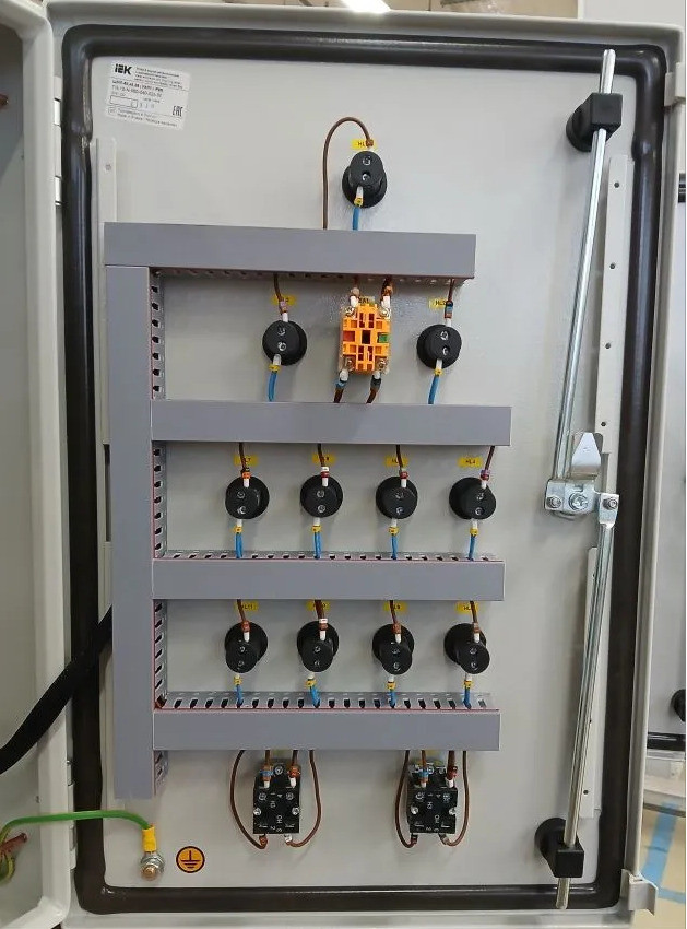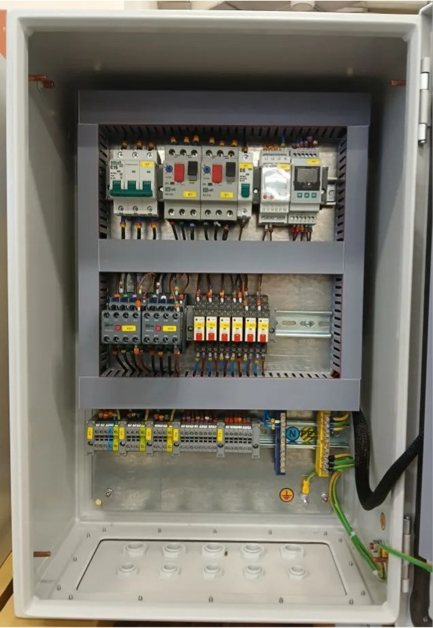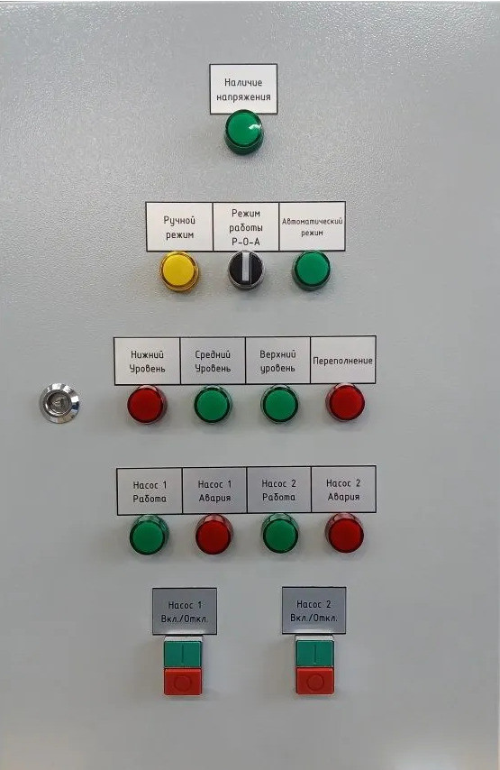 Автоматический выключатель защиты двигателя 3P 4,0-6,3A 2 Автоматический выключатель 3Р 16А х-ка C 1 Авт. выкл. 1Р 6А х-ка C 1 Реле контроля фаз с (с нейтралью) 1 Контактор 9А 220В/230В АС3 АС4 2 Приставка контактная 2НО+2НЗ 2 Колодка с винтовыми зажимами для реле; цвет чёрный 6 Миниатюрное электромеханическое реле, 2 перекидных контакта, 8A/ 250VAC 6 Фиксатор с функцией выталкивания реле. 6 Маркировка для реле. 6 Многофункциональный регулятор уровня жидкости 1 Корпус металлический 600х400х250 IP66, с монтажной платой. 1 Клеммник на DIN-рейку 2,5мм.кв. (серый) 23 Клеммник на DIN-рейку 2,5мм.кв. (синий) 1 Клеммник на DIN-рейку 2,5мм.кв.,(земля) 3 Стопор на DIN-рейку (серый) 20 Кнопка двойная I-O 2 Перекл. 3-х позиционный I-O-II 1 Лампа зелёная LED 220В 6 Лампа красная LED 220В 4 Лампа жёлтая LED 220В 1 Контакт доп. для устр. упр. и сигн. 1 НЗ ДК-22 1 Контакт доп. для устр. упр. и сигн. 1 НО ДК-22 1 Сальник PG 11 диаметр проводника 7-9мм IP54 5 Сальник PG 16 диаметр проводн. 9-13мм IP54 5