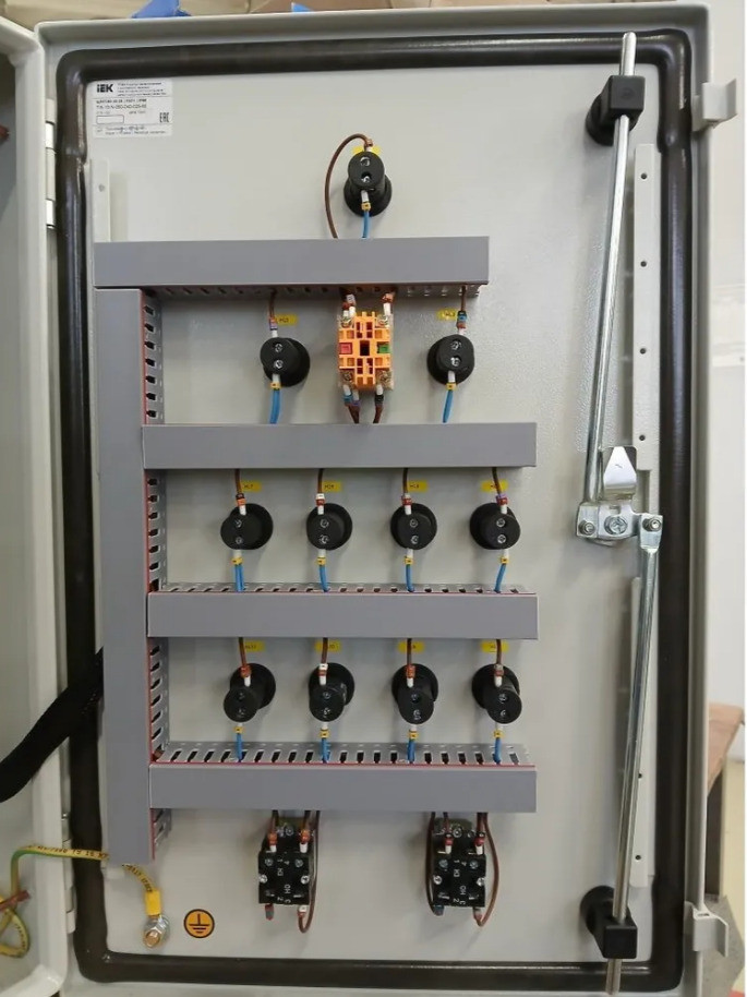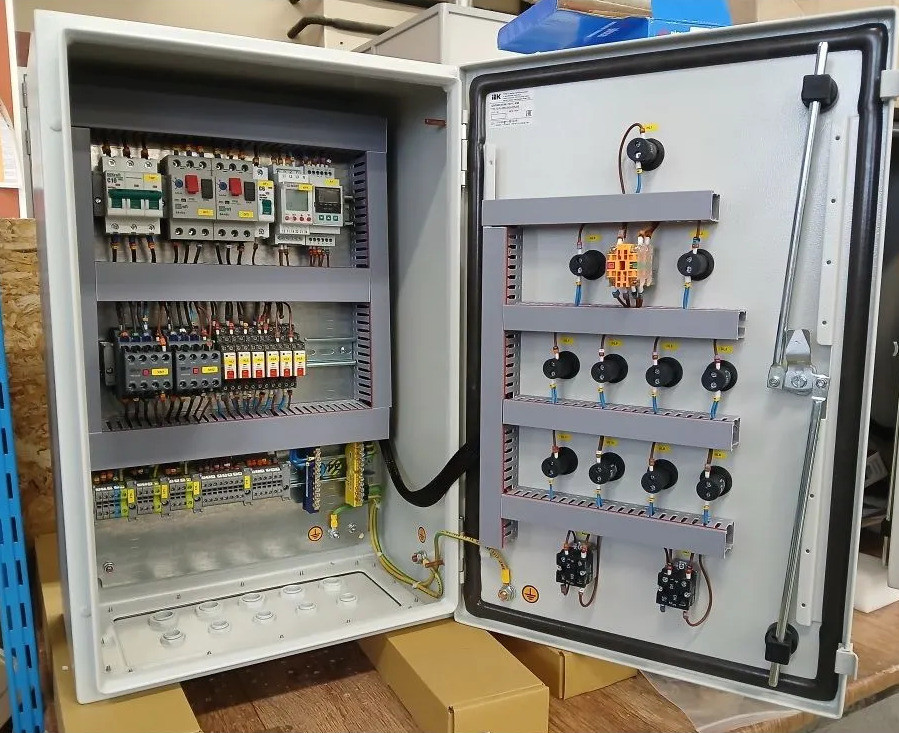 Автоматический выключатель защиты двигателя 3P 2,5-4,0А - 2 шт. Автоматический выключатель 3Р 10А х-ка C - 1 шт. Авт. выкл. 1Р 6А х-ка C - 1 шт. Реле контроля фаз с (с нейтралью) - 1 шт. Контактор 9А 220В/230В АС3 АС4 - 2 шт. Приставка контактная 2НО+2НЗ - 2 шт. Колодка с винтовыми зажимами для реле; цвет чёрный - 6 шт. Миниатюрное электромеханическое реле, 2 перекидных контакта, 8A/ 250VAC - 6 шт. Фиксатор с функцией выталкивания реле. - 6 шт. Маркировка для реле. - 6 шт. Многофункциональный регулятор уровня жидкости - 1 шт. Корпус металлический 600х400х250 IP66, с монтажной платой. - 1 шт. Клеммник на DIN-рейку 2,5мм.кв. (серый) - 23 шт. Клеммник на DIN-рейку 2,5мм.кв. (синий) - 1 шт. Клеммник на DIN-рейку 2,5мм.кв.,(земля) - 3 шт. Стопор на DIN-рейку (серый) - 20 шт. Кнопка двойная I-O - 2 шт. Перекл. 3-х позиционный I-O-II - 1 шт. Лампа зелёная LED 220В - 6 шт. Лампа красная LED 220В - 4 шт. Лампа жёлтая LED 220В - 1 шт. Контакт доп. для устр. упр. и сигн. 1 НЗ ДК-22 - 1 шт. Контакт доп. для устр. упр. и сигн. 1 НО ДК-22 - 1 шт. Сальник PG 11 диаметр проводника 7-9мм IP54 - 5 шт. Сальник PG 16 диаметр проводн. 9-13мм IP54 - 3 шт.