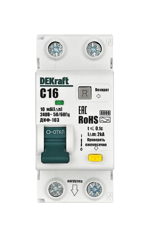Автоматические выключатели дифференциального тока серии ДИФ-103 6кА NEW DEKraft; 1P+N; номинальный ток 16 А; ном. диф. ток 10 мА; тип диф. расцепителя - AC; кривая отключения - С; Icn, Ics = 6 кА; тип устройства - электронный; монтаж – на DIN-рейку. АВДТ обеспечивают три вида защиты — от короткого замыкания, перегрузки и возникновения утечки тока (в частности, вследствие прикосновения человека к токоведущим частям).