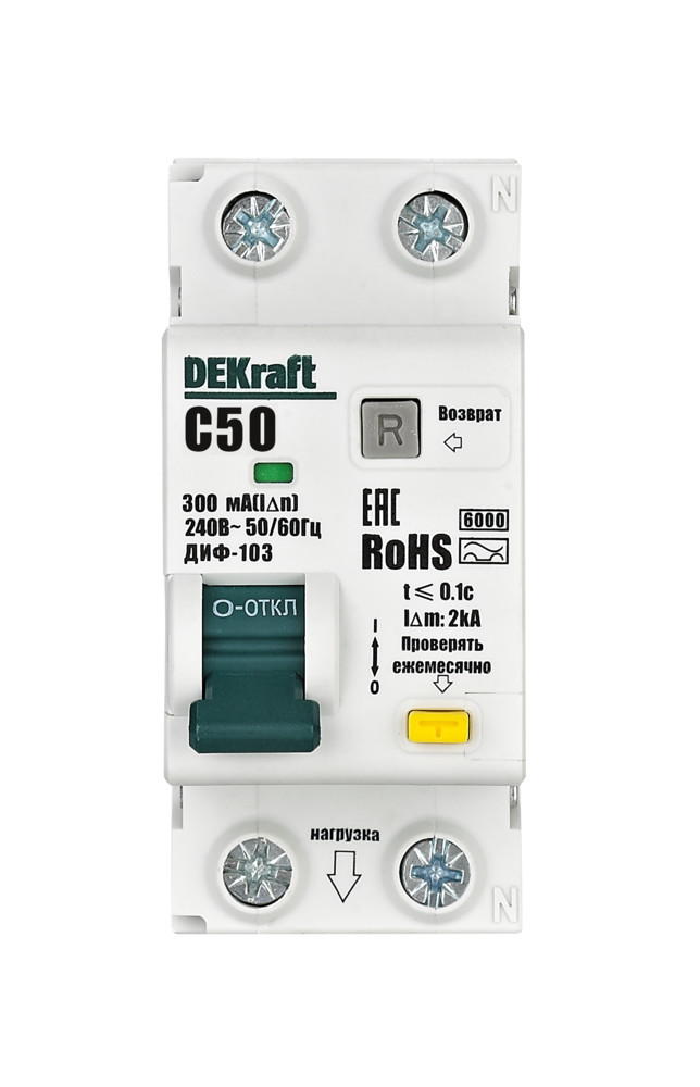 Автоматические выключатели дифференциального тока серии ДИФ-103 6кА NEW DEKraft; 1P+N; номинальный ток 50 А; ном. диф. ток 300 мА; тип диф. расцепителя - A; кривая отключения - С; Icn, Ics = 6 кА; тип устройства - электронный; монтаж – на DIN-рейку. АВДТ обеспечивают три вида защиты — от короткого замыкания, перегрузки и возникновения утечки тока (в частности, вследствие прикосновения человека к токоведущим частям).