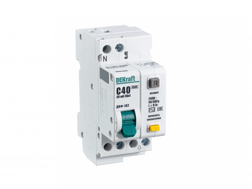 Автоматический выключатель дифференциального тока серии ДИФ-102 DEKraft; 1P+N; ном.ток 40 А; характеристика C; откл.способность Icn = 4,5 kA; ток утечки 30 мА; тип - АС; блок дифф.защиты – электронный; ширина – 2 мод. х 18 мм; монтаж – на DIN-рейку. АВДТ применяются в сетях напряжением до 220 В пер.тока для защиты человека от поражения электрическим током и электроустановок от сверхтоков и токов утечки. Аппараты ДИФ-102 являются более компактным вариантом АВДТ по сравнению с серией ДИФ-101.