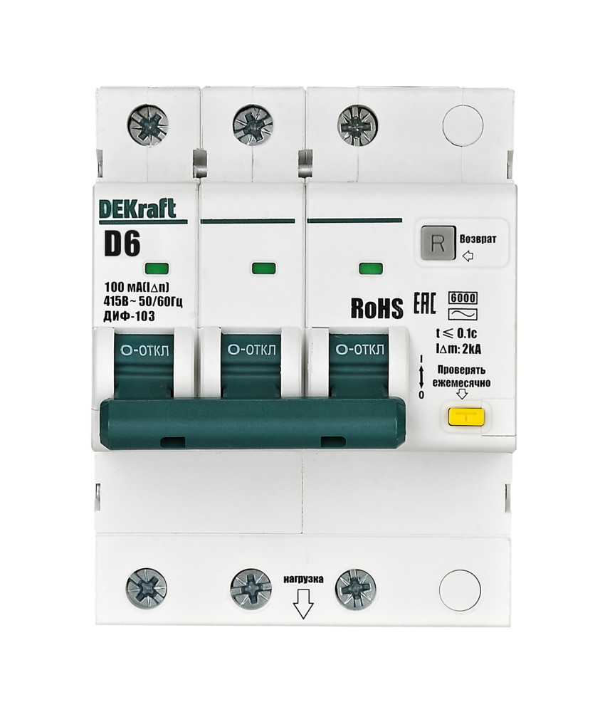 Автоматические выключатели дифференциального тока серии ДИФ-103 6кА NEW DEKraft; 3P; номинальный ток 6 А; ном. диф. ток 100 мА; тип диф. расцепителя - AC; кривая отключения - D; Icn, Ics = 6 кА; тип устройства - электронный; монтаж – на DIN-рейку. АВДТ обеспечивают три вида защиты — от короткого замыкания, перегрузки и возникновения утечки тока (в частности, вследствие прикосновения человека к токоведущим частям).