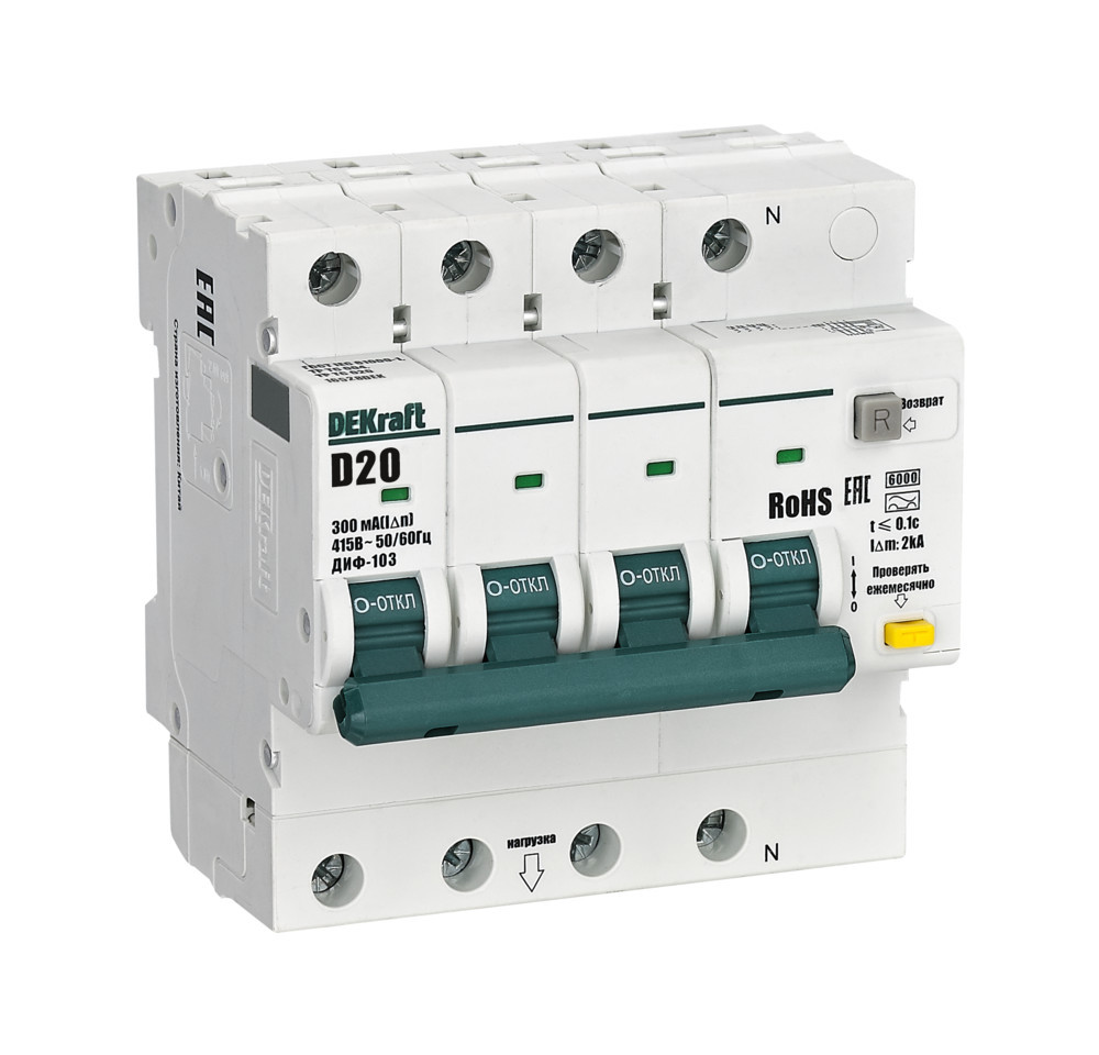 Автоматические выключатели дифференциального тока серии ДИФ-103 6кА NEW DEKraft; 3P+N; номинальный ток 20 А; ном. диф. ток 300 мА; тип диф. расцепителя - AC; кривая отключения - D; Icn, Ics = 6 кА; тип устройства - электронный; монтаж – на DIN-рейку. АВДТ обеспечивают три вида защиты — от короткого замыкания, перегрузки и возникновения утечки тока (в частности, вследствие прикосновения человека к токоведущим частям).