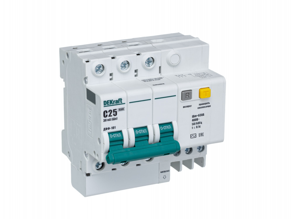 Дифференциальный автоматический выключатель АВДТ 3Р 25А 30мА тип AC х-ка C ДИФ-101 4,5кА DEKraft 15054DEK