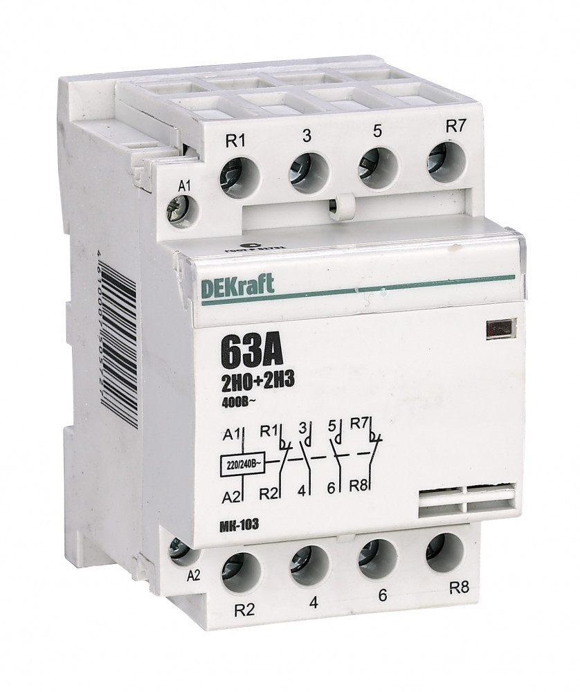 Модульный контактор серии МК-103 DEKraft; ном.ток 40 А (АС-7а); кол-во и исполнение контактов – 2НО+2НЗ; напряжение управления 220 В пер.тока; ширина – 3 мод. х 18 мм; установка – на DIN-рейку. Контакторы МК-103 применяются в сетях напряжением до 400 В пер.тока для дистанционного управления небольшими нагрузками, требующими большого количества включений / отключений, например, насосы, системы вентиляции и т.п. Модульные контакторы не требуют дополнительных настроек и специального обслуживания.