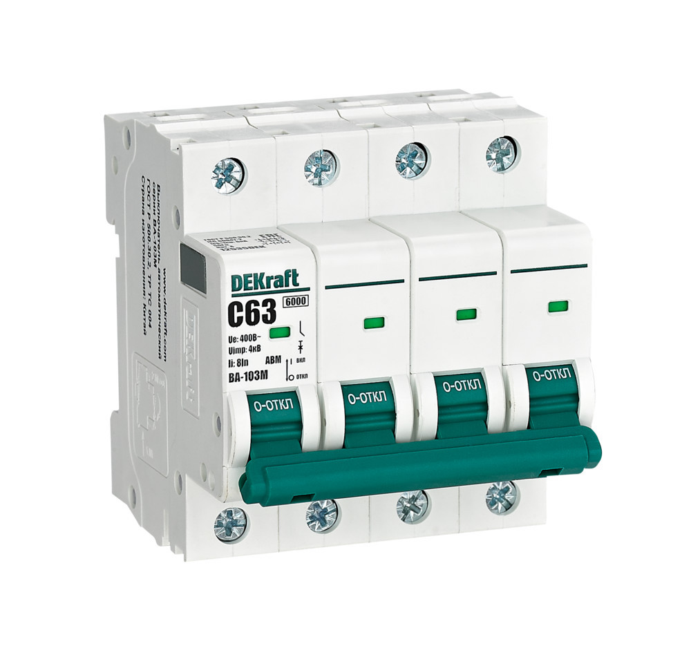Автоматический выключатель без теплозащиты серии ВА-103M DEKraft; 4P; ном. ток 63 А; ном. раб. напряжение 400 В; кривая отключения C. Автоматические выключатели серии ВА-103М имеют специальное назначение для систем противопожарной защиты и вентиляции и выдерживают ток КЗ до 6000 А. Также они могут использоваться для нечастых оперативных включений и отключений указанных цепей. Автоматические выключатели соответствуют директиве RoHS, имеют расширенный диапазон рабочих температур от -25 до +60 °C, удобны и безопасны в эксплуатации.