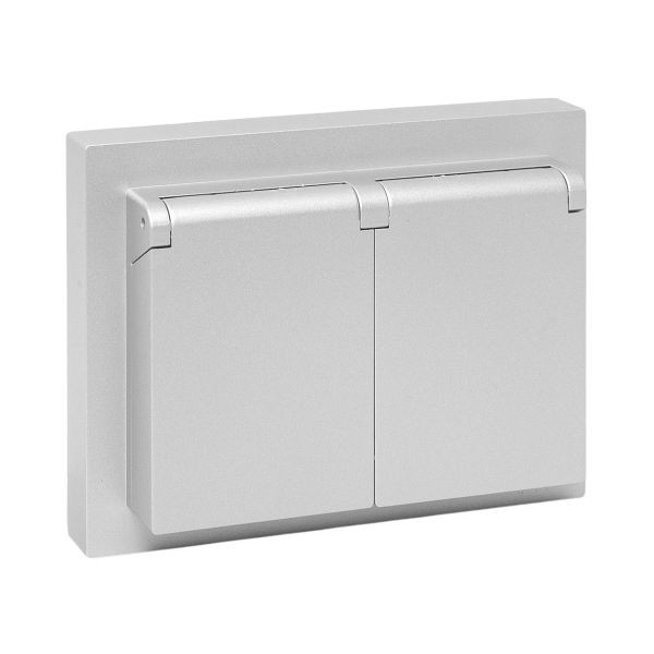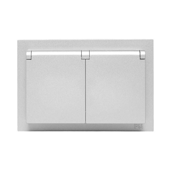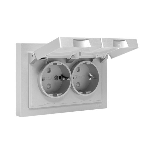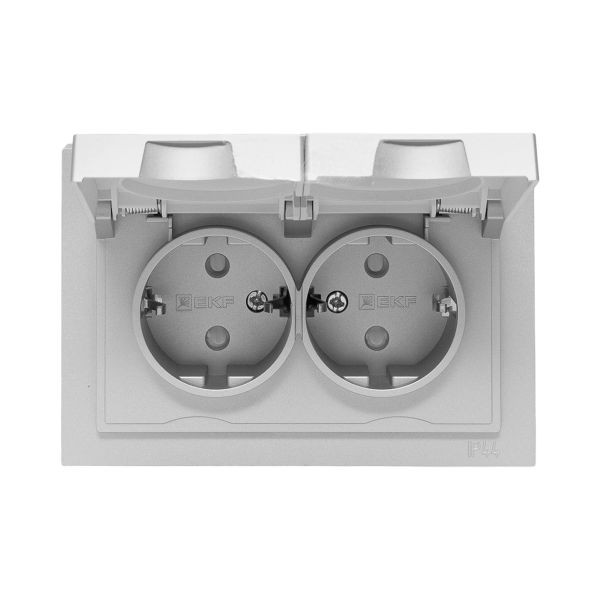 Механизм розетки двойной, 16А, IP44, с заземлением, со шторками, с рамкой, с крышками, алюминий Эпика EKF
