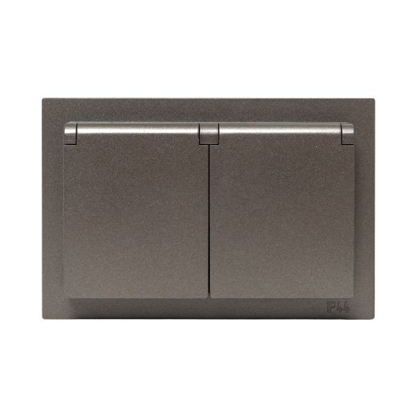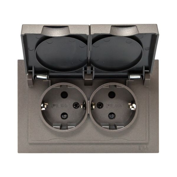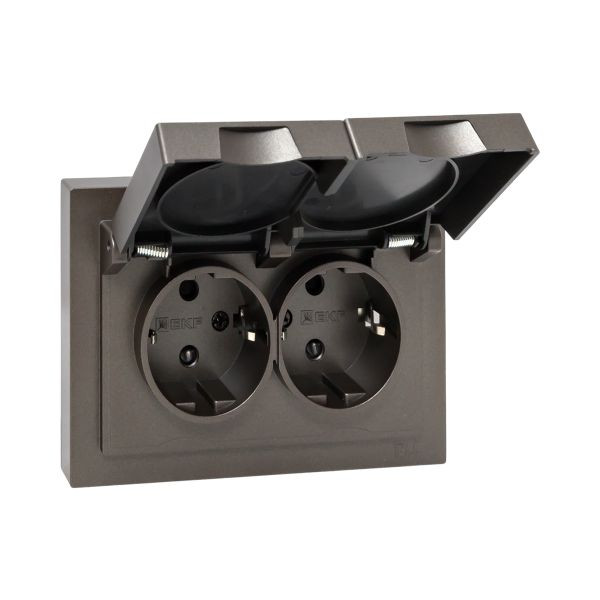 Механизм розетки двойной, 16А, IP44, с заземлением, со шторками, с рамкой, с крышками, мокко Эпика EKF