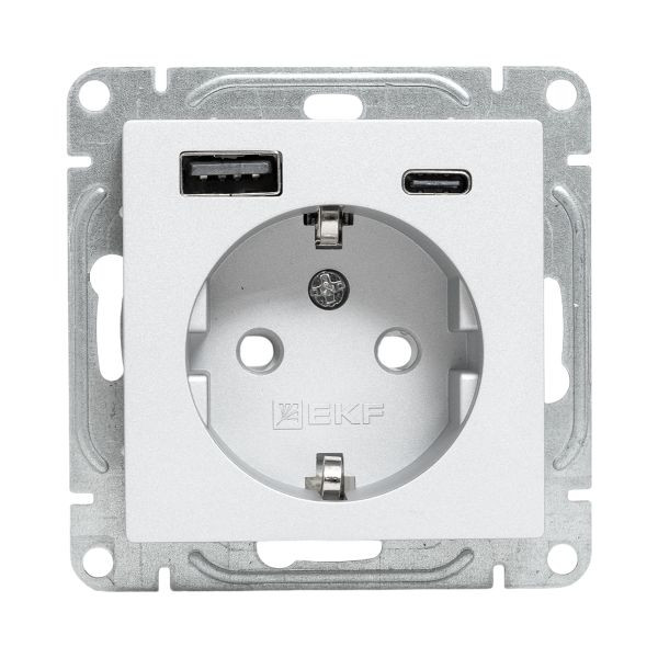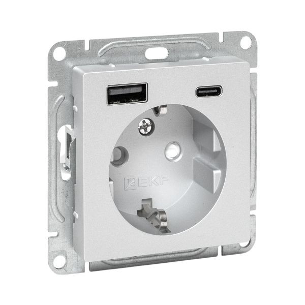 Механизм розетки с USB-A+С - 2шт, 16А, с заземлением, со шторками, алюминий Эпика EKF
