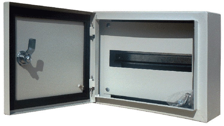 Щит распределительный серии ЩРН DEKraft; навесной; номинальный ток до 125 А; исполнение – 12 мод. х 18 мм, 1 ряд; ВхШхГ - 250х300х120 мм; материал – сталь; цвет - серый (RAL 7035); степень защиты – IP54. Щиты ЩРН имеют встроенные DIN-рейки для модульной аппаратуры, элементы крепления шин N и PE, болты заземления на дверце и на корпусе, дверь с замком и ключом. Доступ к токопроводящим частям закрыт съемной фальшпанелью. Ввод кабелей для всех щитов осуществляется сверху или снизу.