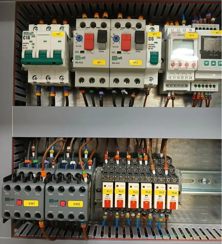 Автоматический выключатель защиты двигателя 3P 4,0-6,3A 2 Автоматический выключатель 3Р 16А х-ка C 1 Авт. выкл. 1Р 6А х-ка C 1 Реле контроля фаз с (с нейтралью) 1 Контактор 9А 220В/230В АС3 АС4 2 Приставка контактная 2НО+2НЗ 2 Колодка с винтовыми зажимами для реле; цвет чёрный 6 Миниатюрное электромеханическое реле, 2 перекидных контакта, 8A/ 250VAC 6 Фиксатор с функцией выталкивания реле. 6 Маркировка для реле. 6 Многофункциональный регулятор уровня жидкости 1 Корпус металлический 600х400х250 IP66, с монтажной платой. 1 Клеммник на DIN-рейку 2,5мм.кв. (серый) 23 Клеммник на DIN-рейку 2,5мм.кв. (синий) 1 Клеммник на DIN-рейку 2,5мм.кв.,(земля) 3 Стопор на DIN-рейку (серый) 20 Кнопка двойная I-O 2 Перекл. 3-х позиционный I-O-II 1 Лампа зелёная LED 220В 6 Лампа красная LED 220В 4 Лампа жёлтая LED 220В 1 Контакт доп. для устр. упр. и сигн. 1 НЗ ДК-22 1 Контакт доп. для устр. упр. и сигн. 1 НО ДК-22 1 Сальник PG 11 диаметр проводника 7-9мм IP54 5 Сальник PG 16 диаметр проводн. 9-13мм IP54 5