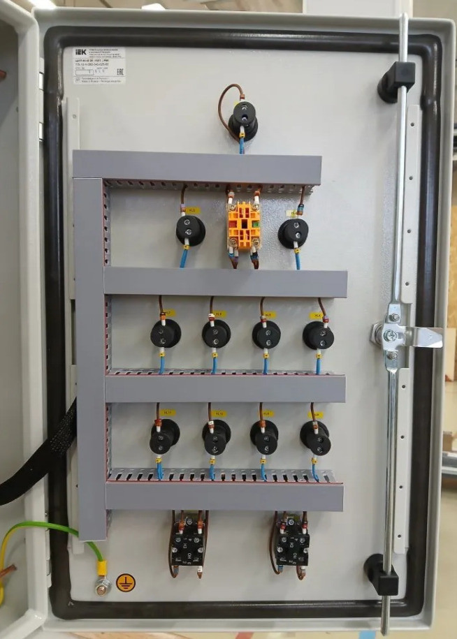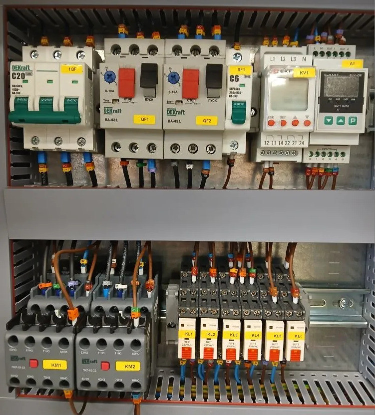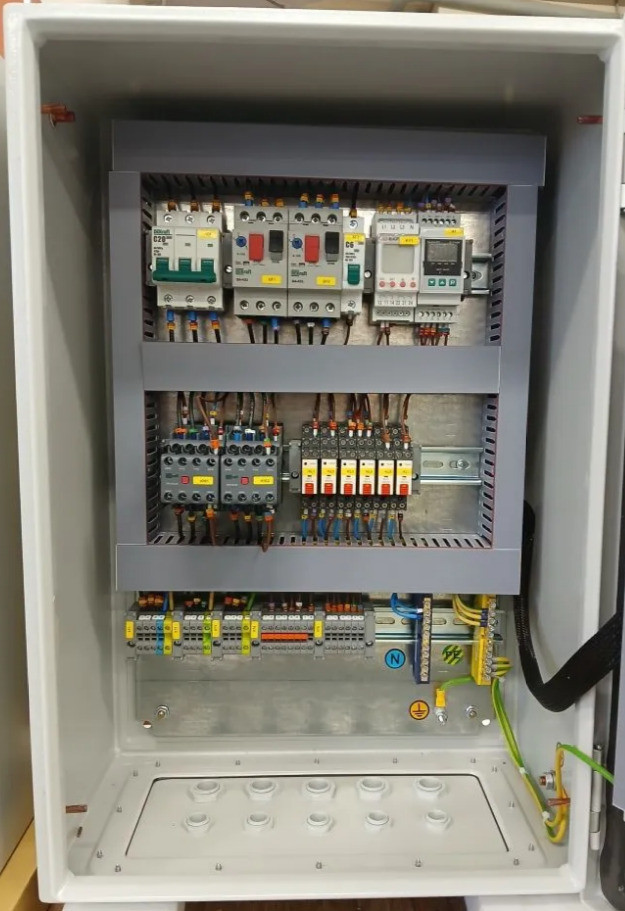 Автоматический выключатель защиты двигателя 3P 6,3-10,0A 2 Автоматический выключатель 3Р 20А х-ка C 1 Авт. выкл. 1Р 6А х-ка C 1 Реле контроля фаз с (с нейтралью) 1 Контактор 12А 220В/230В АС3 АС4 2 Приставка контактная 2НО+2НЗ 2 Колодка с винтовыми зажимами для реле; цвет чёрный 6 Миниатюрное электромеханическое реле, 2 перекидных контакта, 8A/ 250VAC 6 Фиксатор с функцией выталкивания реле. 6 Маркировка для реле. 6 Многофункциональный регулятор уровня жидкости 1 Корпус металлический 600х400х250 IP66, с монтажной платой. 1 Клеммник на DIN-рейку 2,5мм.кв. (серый) 23 Клеммник на DIN-рейку 2,5мм.кв. (синий) 1 Клеммник на DIN-рейку 2,5мм.кв.,(земля) 3 Стопор на DIN-рейку (серый) 20 Кнопка двойная I-O 2 Перекл. 3-х позиционный I-O-II 1 Лампа зелёная LED 220В 6 Лампа красная LED 220В 4 Лампа жёлтая LED 220В 1 Контакт доп. для устр. упр. и сигн. 1 НЗ ДК-22 1 Контакт доп. для устр. упр. и сигн. 1 НО ДК-22 1 Сальник PG 11 диаметр проводника 7-9мм IP54 5 Сальник PG 16 диаметр проводн. 9-13мм IP54 5