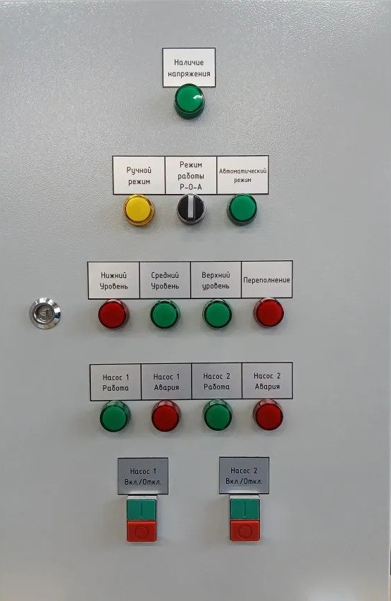 Автоматический выключатель защиты двигателя 3P 2,5-4,0А - 2 шт. Автоматический выключатель 3Р 10А х-ка C - 1 шт. Авт. выкл. 1Р 6А х-ка C - 1 шт. Реле контроля фаз с (с нейтралью) - 1 шт. Контактор 9А 220В/230В АС3 АС4 - 2 шт. Приставка контактная 2НО+2НЗ - 2 шт. Колодка с винтовыми зажимами для реле; цвет чёрный - 6 шт. Миниатюрное электромеханическое реле, 2 перекидных контакта, 8A/ 250VAC - 6 шт. Фиксатор с функцией выталкивания реле. - 6 шт. Маркировка для реле. - 6 шт. Многофункциональный регулятор уровня жидкости - 1 шт. Корпус металлический 600х400х250 IP66, с монтажной платой. - 1 шт. Клеммник на DIN-рейку 2,5мм.кв. (серый) - 23 шт. Клеммник на DIN-рейку 2,5мм.кв. (синий) - 1 шт. Клеммник на DIN-рейку 2,5мм.кв.,(земля) - 3 шт. Стопор на DIN-рейку (серый) - 20 шт. Кнопка двойная I-O - 2 шт. Перекл. 3-х позиционный I-O-II - 1 шт. Лампа зелёная LED 220В - 6 шт. Лампа красная LED 220В - 4 шт. Лампа жёлтая LED 220В - 1 шт. Контакт доп. для устр. упр. и сигн. 1 НЗ ДК-22 - 1 шт. Контакт доп. для устр. упр. и сигн. 1 НО ДК-22 - 1 шт. Сальник PG 11 диаметр проводника 7-9мм IP54 - 5 шт. Сальник PG 16 диаметр проводн. 9-13мм IP54 - 3 шт.